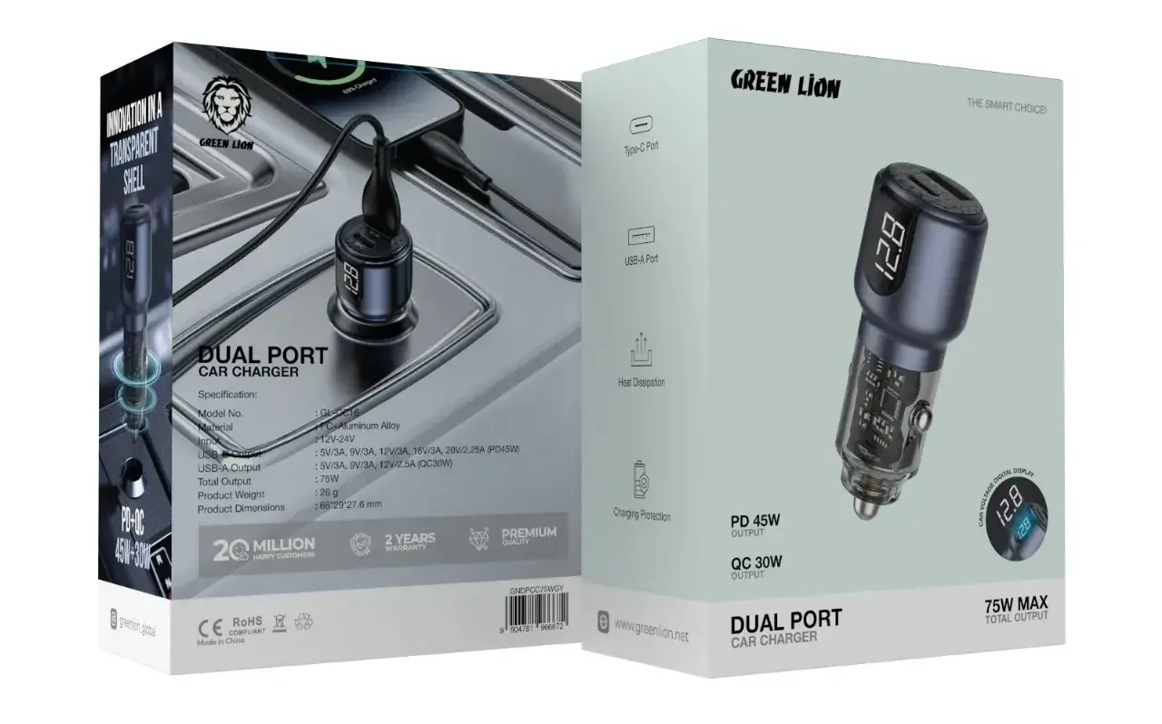 اگر به دنبال شارژری هستید که هم شیک باشد، هم عملکردی عالی داشته باشد و قیمت مناسبی داشته باشد، Green Lion Dual Port Car Charger 75W انتخابی ایدهآل برای شماست.