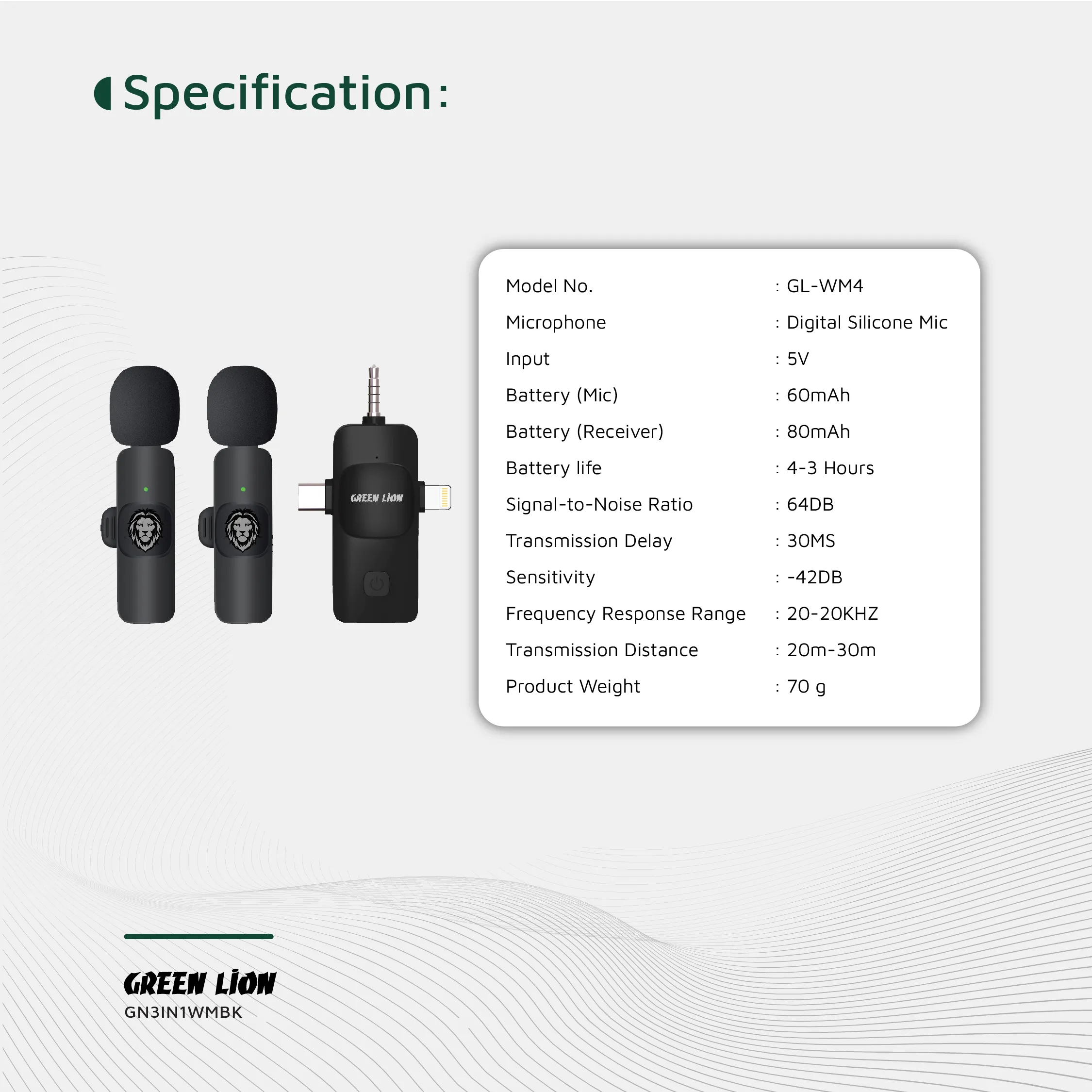 میکروفون Green Lion 3 in 1 یک انتخاب عالی برای تولیدکنندگان محتوا و کسانی است که به دنبال ضبط صدا با کیفیت بالا و کاربری آسان هستند. این میکروفون با قابلیت اتصال چندگانه (Type-C، Lightning، AUX) و عملکرد بیسیم، یکی از بهترین گزینهها برای ضبط ویدیو، پادکست، ولاگ و آموزش آنلاین است. میکروفون دیجیتال سیلیکونی آن صدای شفاف و دقیقی تولید میکند که برای ضبط در محیطهای مختلف ایدهآل است.