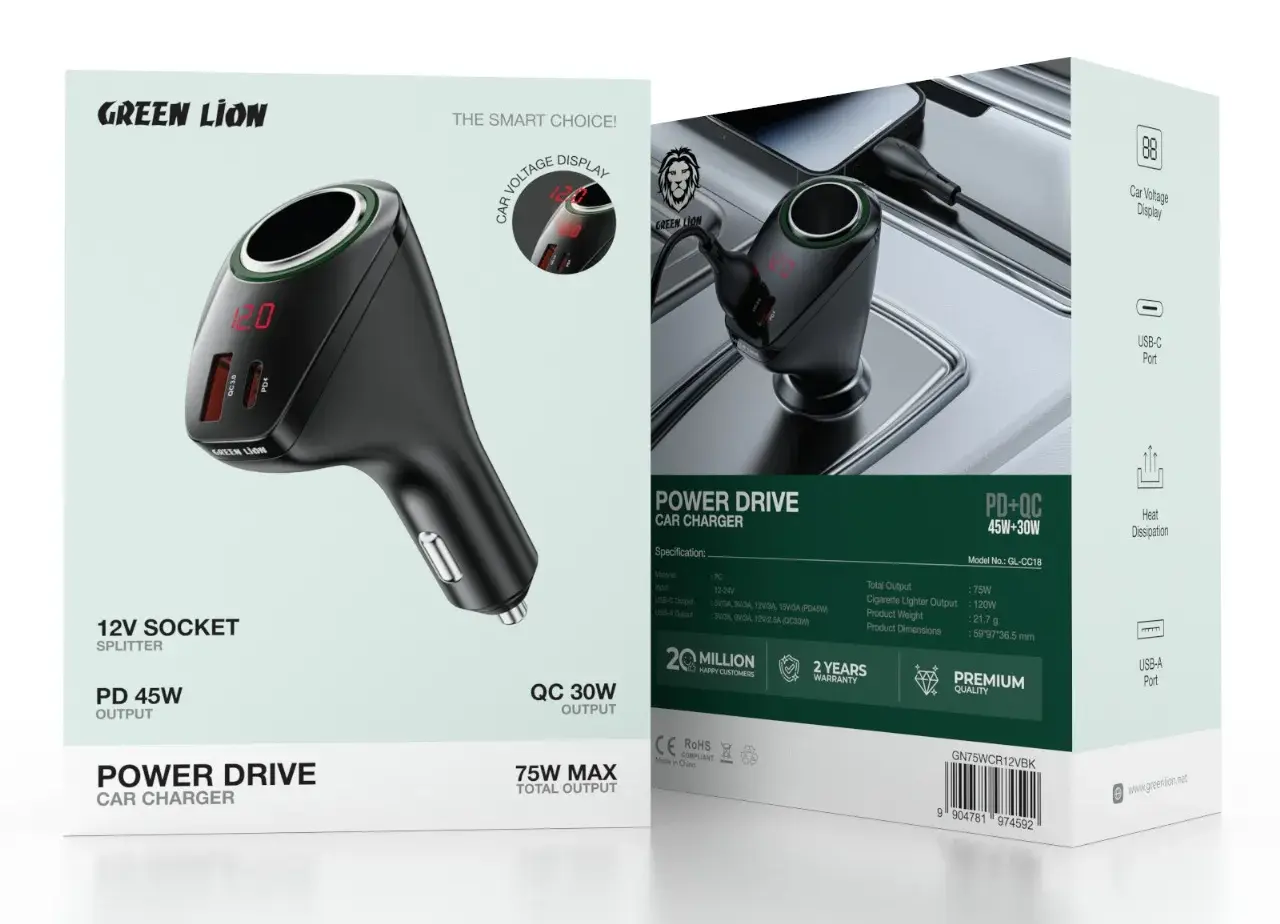 شارژر فندکی Green Lion Power Drive 75W با طراحی مقاوم و ویژگی‌های منحصر به فرد، مناسب برای شارژ همزمان چندین دستگاه در خودرو است. با ورودی ۱۲–۲۴ ولت و خروجی USB‑C و USB‑A، این شارژر قادر است به سرعت دستگاه‌های مختلف مانند گوشی، تبلت، پاوربانک، و حتی لپ‌تاپ‌های سبک را شارژ کند. با داشتن خروجی فندکی ۱۲V و توان ۱۲۰ وات، می‌توانید لوازم جانبی خودرو مانند یخچال کوچک یا چراغ اضطراری را نیز به راحتی از آن استفاده کنید.